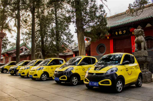 在少林寺門口,偶遇排列整齊的“一步用車”,可以在智能手機(jī)上租用的小電動汽車。