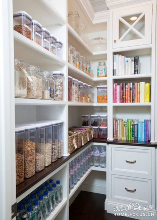 對(duì)于一個(gè)廚房,儲(chǔ)藏室面積是非常寶貴的,這里的貨架是原料的完美收納空間。瓶瓶罐罐全部擺放整齊,保持區(qū)域整潔,增加了廚房的樂(lè)趣。