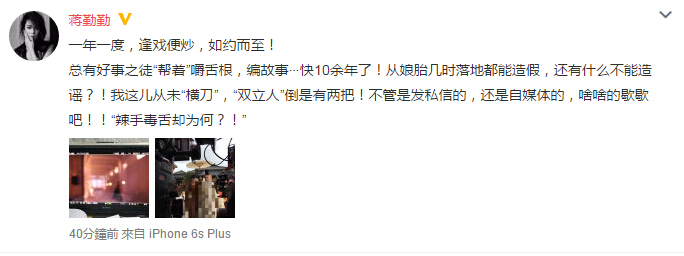 近日,網(wǎng)上流傳出一些關(guān)于蔣勤勤曾橫刀奪愛,從女演員手中搶走陳建斌的緋聞。25日,蔣勤勤發(fā)微博辟謠,表示自己已被造謠了十幾年,并否認自己曾經(jīng)插足他人感情。蔣勤勤還勸告某些造謠者“歇歇吧”:“一年一度,逢戲便炒,如約而至!總有好事之徒“幫著”嚼舌根,編故事……快10余年了!從娘胎幾時落地都能造假,還有什么不能造謠?!我這兒從未“橫刀”,“雙立人”倒是有兩把!不管是發(fā)私信的,還是自媒體的,啥啥的歇歇吧??!辣手毒舌卻為何?!”