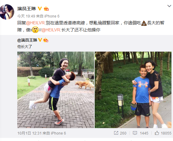 網(wǎng)友看到這一對高顏值的母子后,紛紛留言表示羨慕,而有網(wǎng)友卻在微博下辱罵到:“長大了還不讓他x你。”此毀三觀評論也惹怒王琳,并手撕網(wǎng)友回罵道:“別在這里透道德底線,想亂倫趕緊回家,你這個吃屎長大的智障,傻x!”