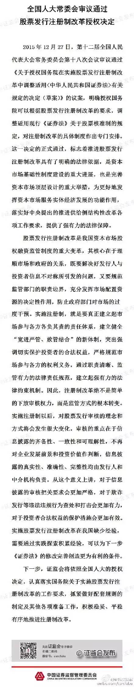點(diǎn)評(píng):這里說(shuō)的“實(shí)施期限為兩年”,不是說(shuō)注冊(cè)制只搞兩年。而是說(shuō),在《證券法》正式修行完成之前,這種人大授權(quán)方式下的注冊(cè)制,只搞兩年。兩年之后,《證券法》就修訂完成了,將來(lái)法律規(guī)定的制度就是注冊(cè)制。