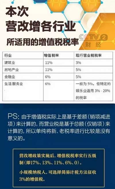 5月1日“營(yíng)改增”全面推開,建筑業(yè)、房地產(chǎn)業(yè)、金融業(yè)、生活服務(wù)業(yè)將告別營(yíng)業(yè)稅。這項(xiàng)看起來“高大上”的改革,涉及近千萬戶新納稅人、全年減稅超5000億元。營(yíng)業(yè)稅退出歷史,你我能獲多大好處?