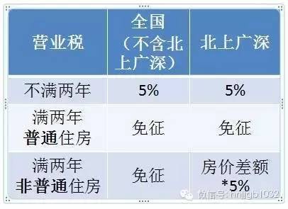 但“北上廣深”四個(gè)一線城市暫不實(shí)施,也就是說(shuō),北上廣深在營(yíng)業(yè)稅政策方面仍實(shí)行財(cái)稅〔2015〕39號(hào)文,即個(gè)人購(gòu)買不足2年的住房對(duì)外銷售的,全額征收營(yíng)業(yè)稅;個(gè)人購(gòu)買2年以上(含2年)的非普通住房對(duì)外銷售的,按照其銷售收入減去購(gòu)買房屋的價(jià)款后的差額征收營(yíng)業(yè)稅;個(gè)人購(gòu)買2年以上(含2年)的普通住房對(duì)外銷售的,免征營(yíng)業(yè)稅。