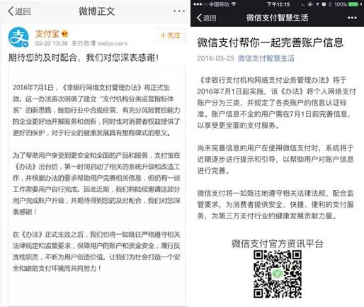 受到央行新規(guī)的約束,支付寶、微信支付等網(wǎng)絡(luò)支付平臺為了保證用戶在7月1日后依然能順利使用現(xiàn)有支付服務,因此紛紛開始行動。