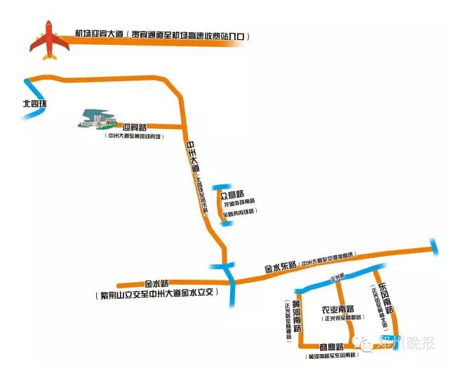 2、機(jī)場迎賓大道(貴賓通道至機(jī)場高速收費(fèi)站入口)、中州大道(北四環(huán)至鄭汴路)、迎賓路(中州大道至黃河迎賓館)、金水東路、(京港澳高速至中州大道)、金水路(中州大道金水立交至紫荊山立交立交)、黃河?xùn)|路(中州大道黃河立交至九如路)、眾意路(龍湖外環(huán)南路至商務(wù)內(nèi)環(huán)路)、黃河南路(正光路至商鼎路)、農(nóng)業(yè)南路(正光街至商鼎路)、東風(fēng)南路(正光街至榆林北街)、商鼎路(東風(fēng)南路至黃河南路)等道路和路段。經(jīng)過以上道路和路段的車輛和行人,遇到臨時交通管制時,可以提前就近選擇其它道路繞行。