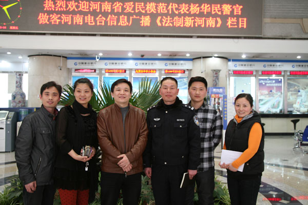 2012年3月16日下午四點,中央電視臺攝制組進(jìn)入河南電臺信息廣播《法制新河南》節(jié)目直播間進(jìn)行了拍攝。在節(jié)目中做客的是全國愛民模范鄭州市花園路農(nóng)業(yè)路楊華民交通示范標(biāo)準(zhǔn)崗崗長楊華民。