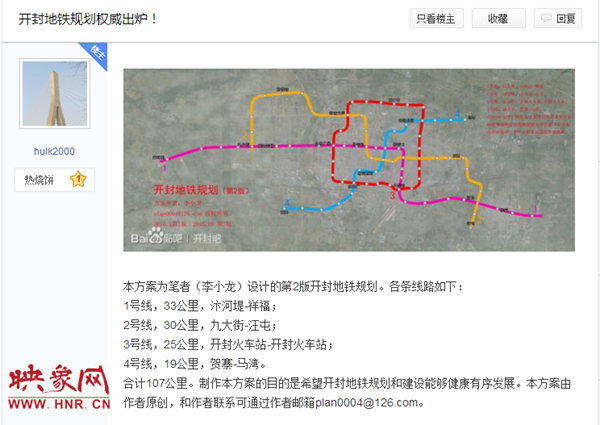 【傳聞】11月初,網(wǎng)絡(luò)上謠傳“開(kāi)封要修建地鐵,市區(qū)內(nèi)規(guī)劃了4條線路”不少開(kāi)封市民在網(wǎng)上看到一則關(guān)于開(kāi)封要修建地鐵的消息,引來(lái)一片熱議,同時(shí)市民在論壇上也有發(fā)帖熱議。