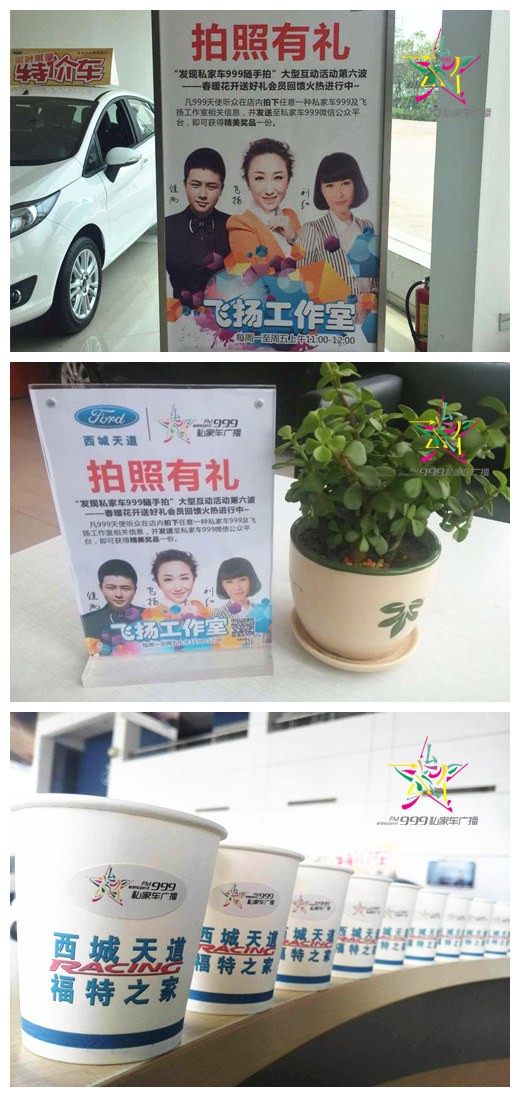 6月3日起至6月9日,凡999聽眾至聯(lián)盟商家店內(nèi)拍下私家車廣播logo以及“飛揚(yáng)工作室”任一相關(guān)信息,并發(fā)送關(guān)鍵詞“發(fā)現(xiàn)999”至我們微信公眾平臺,同時留下你的“姓名+電話”,前50位車友均可獲贈2升機(jī)油!