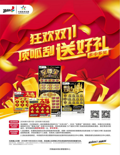 激情綻放十一月,愉悅驚喜帶回家!給力鉅惠超劃算,盡在體彩“頂呱刮”!活動詳情請咨詢?nèi)「黧w彩銷售網(wǎng)點(diǎn)。