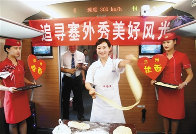 為了慶祝首發(fā),李惠萍帶領(lǐng)幾名高姐,策劃了各種小環(huán)節(jié)來和旅客互動,現(xiàn)場做燴面、拉牛肉面,整個(gè)車廂熱熱鬧鬧。