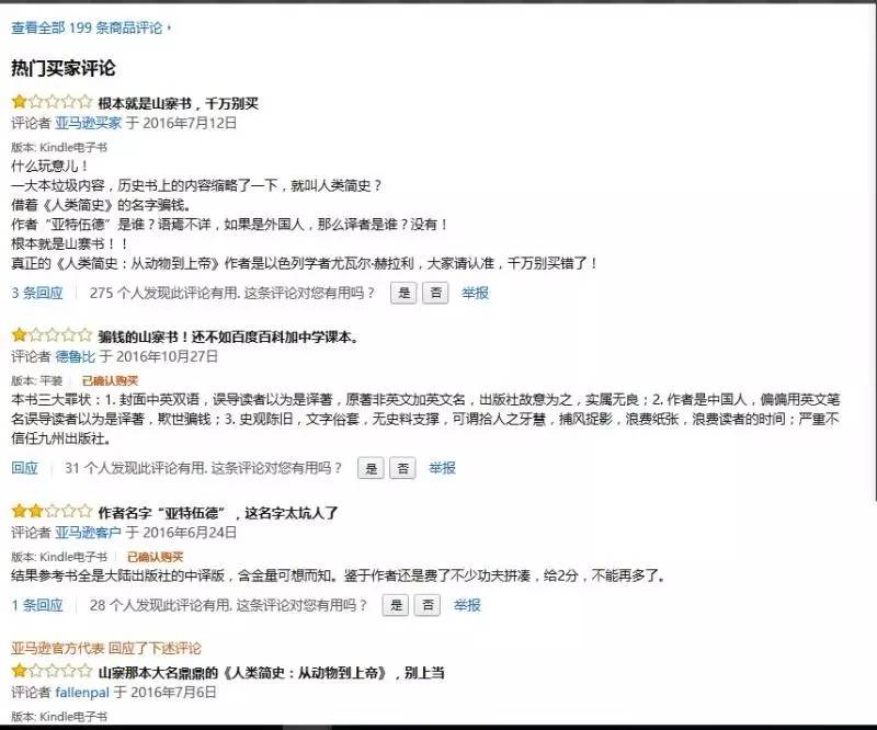“我居然讀了一本假書?!痹诙拱?,一位買到《人類簡史——我們?nèi)祟愡@些年》的讀者如此感慨。大量吐槽出現(xiàn)在豆瓣和亞馬遜等平臺,該書在豆瓣評分低至2.5分,并被打上了“山寨”字樣。