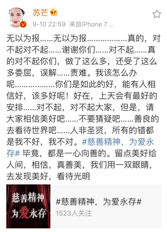 蘇芒微博全文:無以為報,無以為報……真的,對不起對不起,謝謝你們,對不起,真的對不起你們,做了那么多,還受這么多委屈、誤解、責(zé)難。我該怎么辦呢……你們是如此的好,能有人相信好,該有多好呢!好在上天會有最好的安排……對不起,對不起大家。但是請大家相信美好吧……不要猜疑吧……善良的去看待世界吧……人非圣賢,所有的錯都是我不好,我不對。畢竟,都是一心向善的。留點(diǎn)美好給人間,相信,真善美,我們用一雙眼睛,去發(fā)現(xiàn)美好,看待光明。