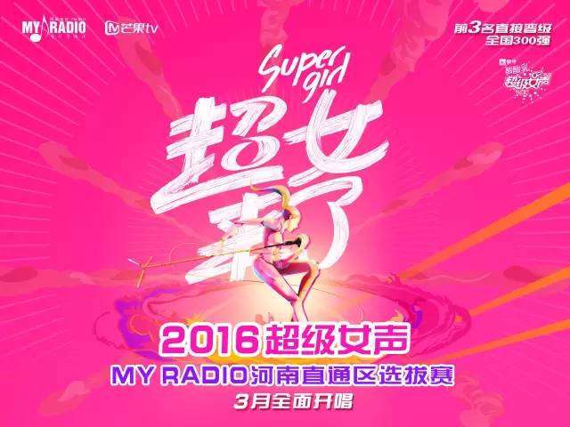 My Radio聯(lián)合芒果TV,2016超級(jí)女聲My Radio河南直通區(qū)選拔賽重磅開(kāi)啟!河南賽區(qū)冠亞季軍,直接晉級(jí)全國(guó)300強(qiáng)。