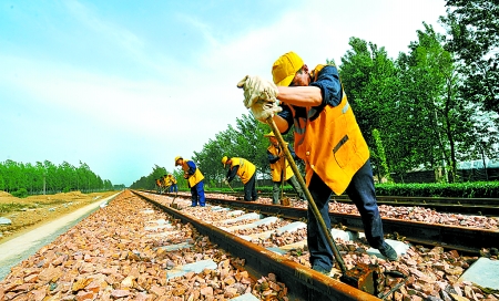 4月27日,我省鐵路工人正在山西中南部鐵路大通道河南濮陽(yáng)段施工現(xiàn)場(chǎng),對(duì)剛鋪設(shè)的道軌進(jìn)行修整。該鐵路大通道濮陽(yáng)段自開工以來(lái)已完成投資31.68億元,完成路基土石方889.89萬(wàn)方、橋梁21026米、涵洞5802米、鋪軌166公里。該鐵路建成通車后將成為我國(guó)第一條真正意義上的重載鐵路。高 林 劉榮莉 攝