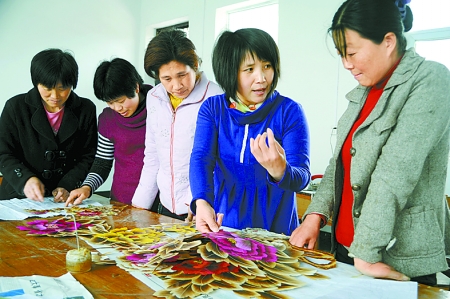 4月16日,汝南縣明振麥草畫工藝品廠的工人們正在一起交流制作技術。該企業(yè)的麥草畫暢銷日、韓等60多個國家,帶動當地400多名婦女就業(yè)。