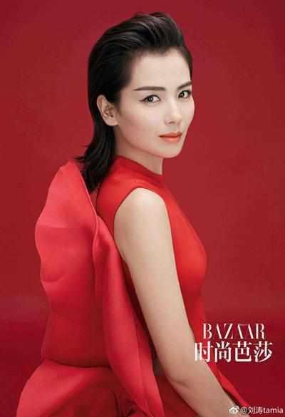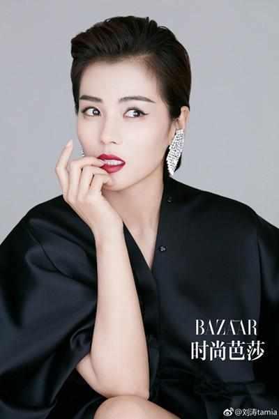 為雜志拍攝大片的時(shí)候,劉濤身穿黑色的寬松衣服,后背短發(fā),烈焰紅唇,個(gè)性十足的耳飾,整體造型又酷又美的!