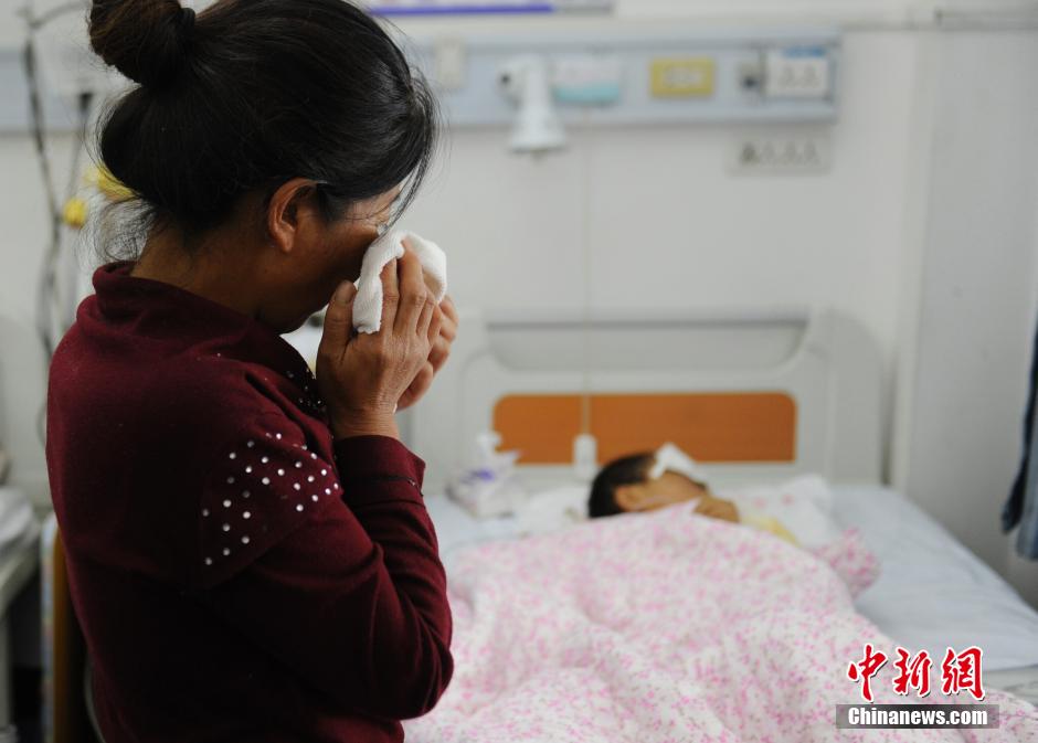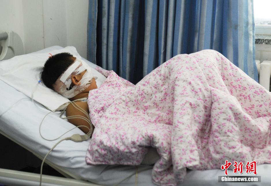 10月13日,12歲的朱某正在吉林大學第二醫(yī)院接受治療。據(jù)其家人介紹,10月11日,朱某獨自在家,遭同村村民王某挖出雙眼,行兇者還點燃了他家的房子,朱某靠裝死逃過一劫。王某事后自殺。目前雖經(jīng)手術治療,但朱某右眼視力已無恢復的可能,左眼亦不樂觀。警方正對此案進行調查。中新社記者 張瑤 攝