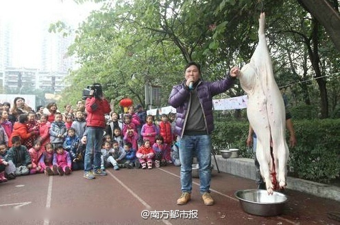 12月24日下午,重慶玉帶山小學(xué)舉行“民俗文化代代傳 傳統(tǒng)文化進校園”活動。學(xué)校從鄉(xiāng)下買回兩頭年豬,請來村民講述年豬習(xí)俗,殺豬匠殺豬后,科學(xué)老師為學(xué)生講解年豬身體結(jié)構(gòu)。