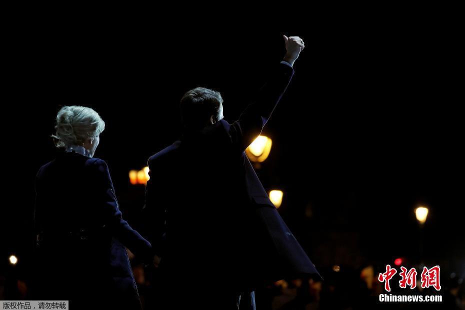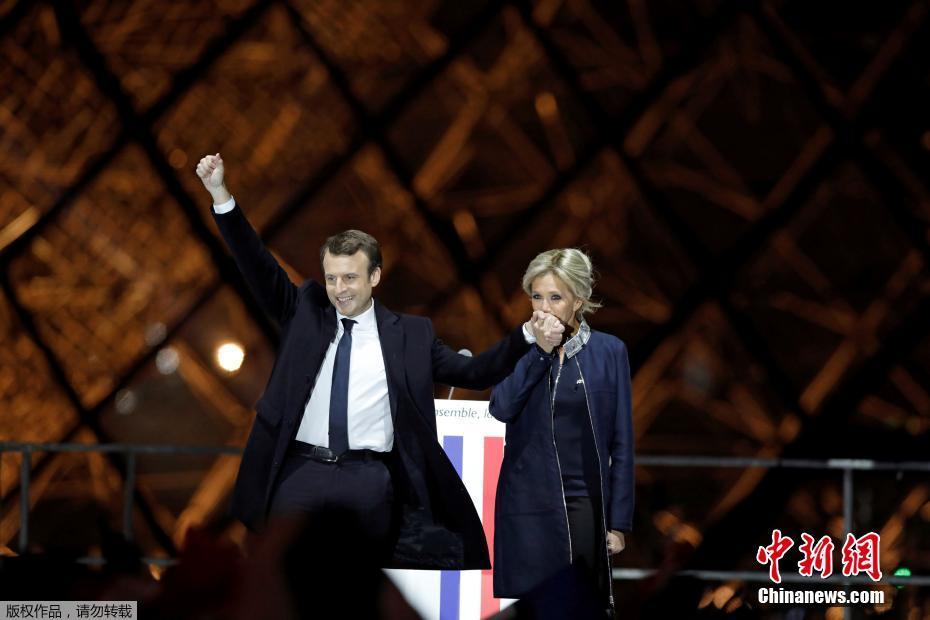 巴黎時間5月7日晚,法國總統(tǒng)選舉第二輪投票初步計票結(jié)果顯示,中間派獨立候選人、“前進”運動領(lǐng)導(dǎo)人埃馬紐埃爾·馬克龍以大幅優(yōu)勢擊敗極右翼政黨“國民陣線”候選人馬麗娜·勒龐。年僅39歲的馬克龍由此成為法國史上最年輕的總統(tǒng),也成為世界上最年輕的大國領(lǐng)導(dǎo)人。圖為馬克龍(左二)和妻子布麗吉特(右二)在慶祝勝選的集會上向支持者致意。中新社記者 龍劍武 攝