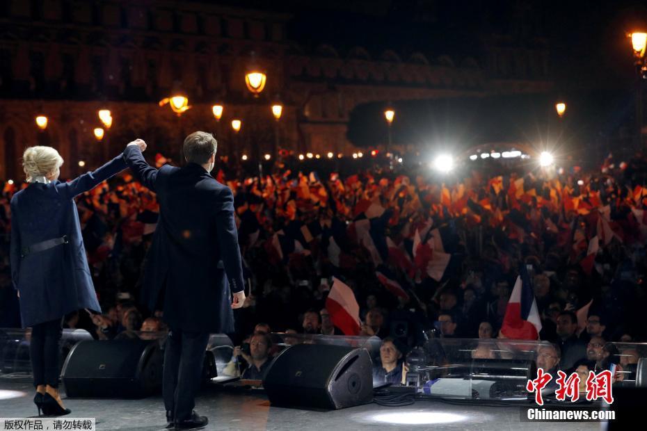 巴黎時間5月7日晚,法國總統(tǒng)選舉第二輪投票初步計票結(jié)果顯示,中間派獨立候選人、“前進”運動領(lǐng)導(dǎo)人埃馬紐埃爾·馬克龍以大幅優(yōu)勢擊敗極右翼政黨“國民陣線”候選人馬麗娜·勒龐。年僅39歲的馬克龍由此成為法國史上最年輕的總統(tǒng),也成為世界上最年輕的大國領(lǐng)導(dǎo)人。圖為馬克龍的支持者在得知馬克龍當(dāng)選后歡呼。中新社記者 龍劍武 攝