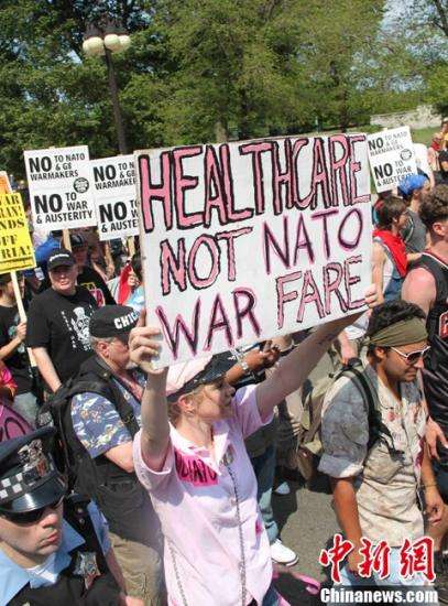 北約峰會(huì)5月20日在芝加哥開幕,萬余名示威者掀起規(guī)??涨暗挠涡锌棺h活動(dòng)。圖為當(dāng)天游行中的一個(gè)場景,右側(cè)為正在執(zhí)勤的警察,中為一名美女示威者,左側(cè)為一名參加過阿富汗戰(zhàn)爭的美國退伍軍人。中新社發(fā)李洋攝