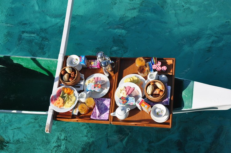 住在島上的水木屋里,睜開(kāi)眼睛的時(shí)候,會(huì)有一對(duì)當(dāng)?shù)氐目∧忻琅?,劃著一艘?dú)木舟,送上濃香的咖啡,配上吐司和各色水果。當(dāng)然這頓早餐價(jià)格不菲哦!