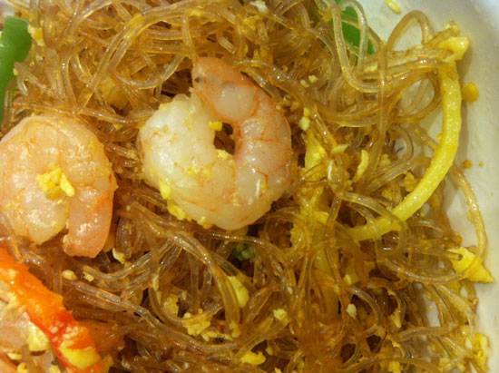 4、粉絲鍋中炒干后放入炒制好的蝦仁和雞蛋碎調(diào)味加入雞粉、鹽、味精翻炒均勻即可。
