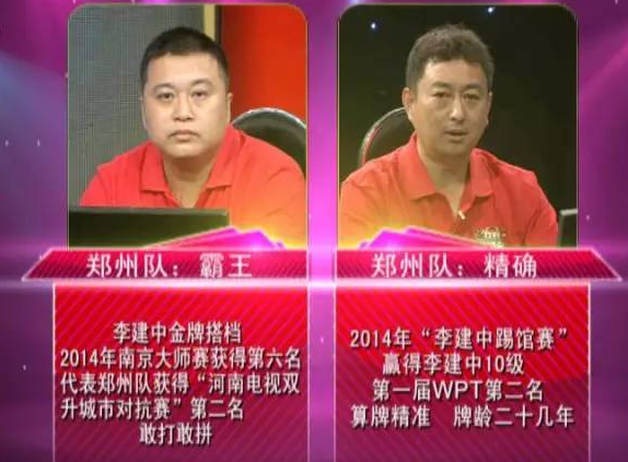 鄭州隊派出了“霸王”和“精確”?!鞍酝酢痹?015年“李建中踢館賽”期間,與李建中是金牌搭檔;在2014年南京大師賽上獲得第六名;曾代表鄭州隊獲得“河南電視雙升城市對抗賽”第二名,經(jīng)?;钴S在雙升銀屏的舞臺上。