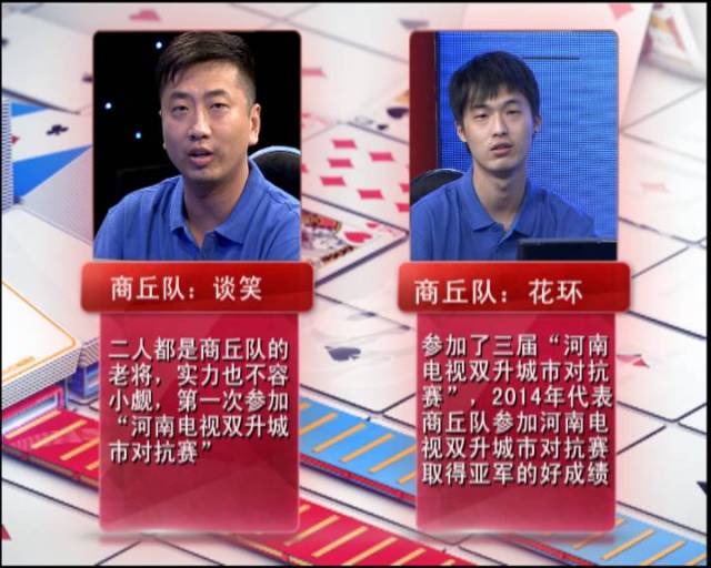 商丘隊(duì)派出了“花環(huán)”和“談笑”。兩人都是商丘隊(duì)的老將,實(shí)力不容小覷?!盎ōh(huán)”曾參加三屆“河南電視雙升城市對(duì)抗賽”;2014年代表商丘隊(duì)參加“河南電視雙升城市對(duì)抗賽”,并取得亞軍的好成績(jī)?!罢勑Α钡谝淮螀⒓印昂幽想娨曤p升城市對(duì)抗賽”。
