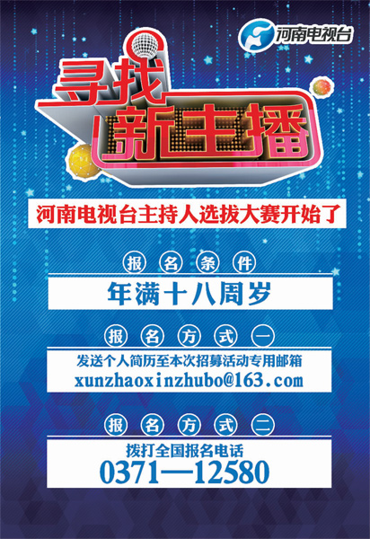 10月1日起,河南電視臺將啟動(dòng)“尋找新主播”活動(dòng)。這是由河南電視臺都市頻道承辦的一檔大型主持人選拔活動(dòng),選拔范圍輻射全國,無論你在哪里,無論你正在從事哪個(gè)行業(yè),只要您年滿18周歲,沒準(zhǔn)兒下一個(gè)“新主播”就是你!