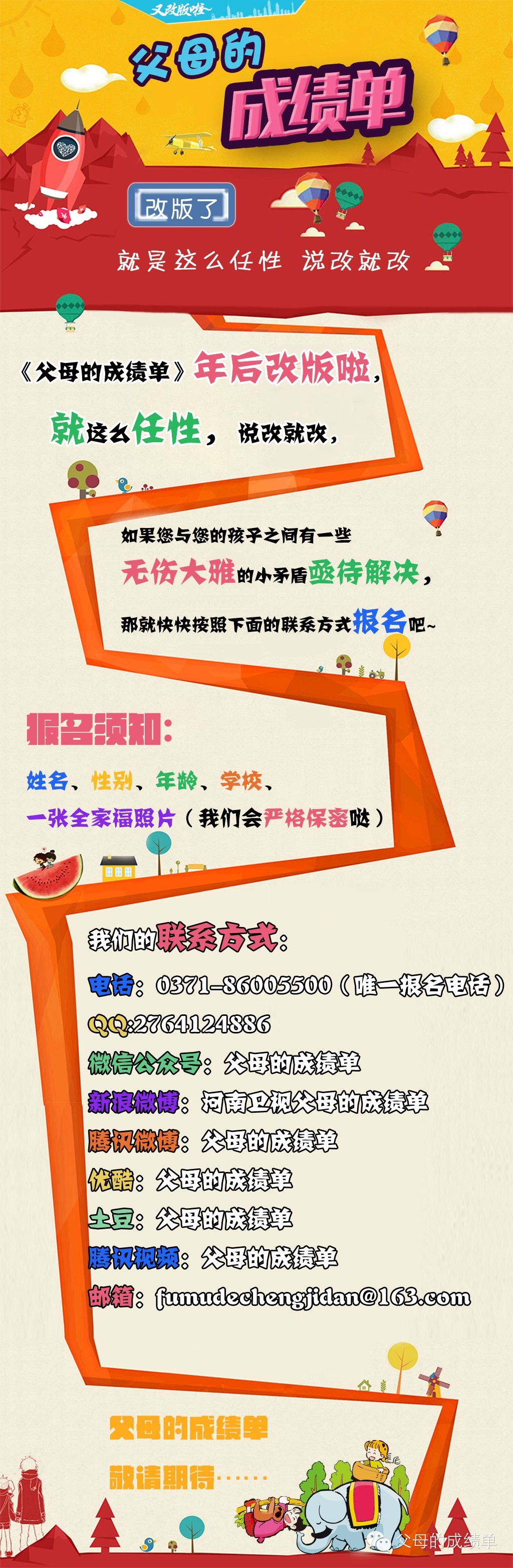 年后,經過導演大大和眾小編們的熱切商討,《父母的成績單》又改版啦。我們就是這樣任性,說改就改,為了什么?為了讓可敬可愛的觀眾朋友們看到更優(yōu)質更具有內涵的節(jié)目,希望你們能喜歡我們的節(jié)目,能感受到我們每一位幕后工作者的用心付出。我們真誠的期望每一位家長都能耐心的用更好的方式來與您的孩子溝通相處,更期望每一位孩子都能健康快樂的成長。