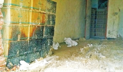 昨日15時(shí)35分,位于鄭州市107輔道以北的該處八堡村民房?jī)?nèi),至少兩個(gè)房間碼放的方形紙箱堆積有兩米多高,遠(yuǎn)遠(yuǎn)就能嗅到刺鼻氣味。紙箱外包裝及紙箱內(nèi)的液體塑料包裝瓶體,均無物品名稱、生產(chǎn)廠家等標(biāo)識(shí)。房間內(nèi)墻體上的一張貼畫有一半被燒掉發(fā)黑,地面有白色的粉末狀不明物質(zhì)和摻雜的黃土。