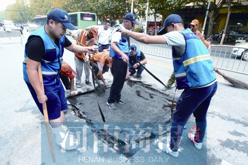 臺風“天鴿”讓鄭州下了幾天的雨,許多道路積水塌方車輛陷進去。中央氣象臺預報臺風“帕卡”已經(jīng)登陸南方,受其影響鄭州又將面臨幾天的降雨,道路養(yǎng)護工們要趕在降雨前修復路面坑槽,預防各種危害的發(fā)生。